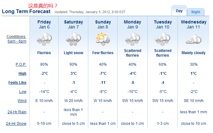 加拿大的鬼天气预报真是没的说,夏天预报下雨那叫一个离谱,可到了冬天,就准的一塌糊涂。 |