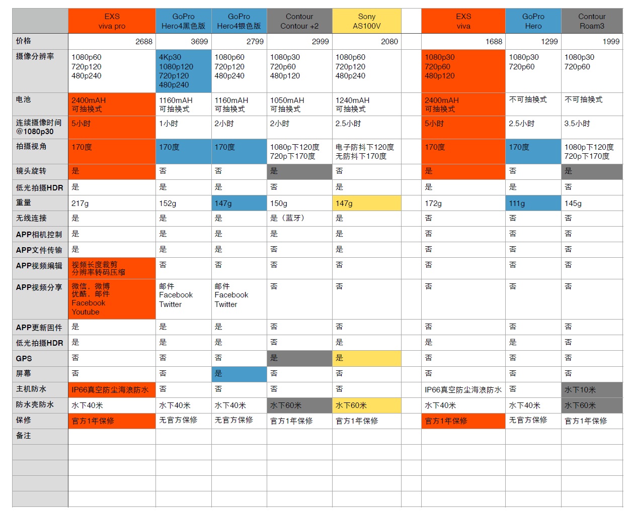 看图说话,图表价格为人民币定价。 图上看来,GOPRO hero4的性能参数没法超越啊